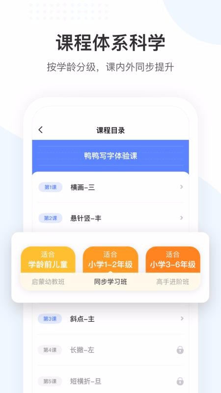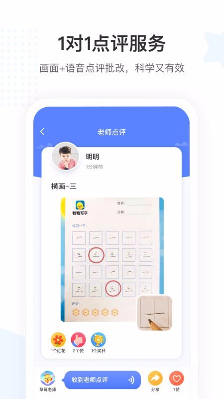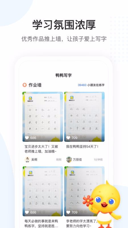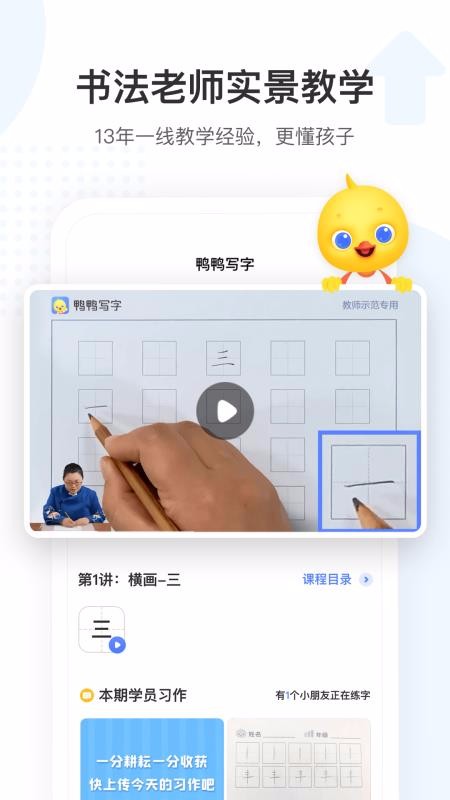鸭鸭写字app是专为5-12岁儿童打造的线上硬笔规范书法教育学习软件,家长每天抽出15分钟的时间陪伴孩子一起看在线录播课程,让孩子跟着课程内容去练习,每天15分钟,从小开始,让孩子轻松练出一手好字;随时随地想学就学,没有任何的限制,家长还能在软件中给孩子寻找优质的辅导老师,全程线上辅导孩子写字,实时追踪孩子练字状态,老师每天都会布置学习任务,孩子线下完成,做完后直接在软件中提交给老师,老师在线批改,孩子有练习不对的地方及时给出针对性的意见,让家长可以看到孩子的变化,快速练好书法。