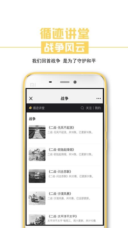 循迹讲堂app是一款在线学习软件,主要是以音频的方式为您提供教学,让您可以更好的在这里听课学习,还可以得到更好的学习效果;同时这里的所有课程音频都可以下载,还支持后台播放,完全不影响你玩手机,让您可以边听课边玩手机;这里的课程内容有历史、文学、经济、战争、艺术等领域的资源,你可以在这里快速的选择你喜欢的内容进行收听,可以满足用户的各种学习需求;同时还支持自动按顺序连续播放,听完后可以为您自动的播放下一曲,无需你再次进行操作,你也可以快速的进行切换,非常的方便。