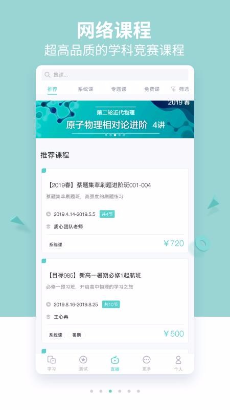 质心在线app是一款给中学生学习生物、物理、化学竞赛知识的软件;这款软件为中学竞赛生提供了一站式的教学服务,拥有生物、物理、数学、化学多个竞赛学科的丰富优质的资源;软件中有许多竞赛名师以短视频的形式精讲各学科的竞赛核心知识点,让竞赛生准确理解知识点的奥义以便于打好竞赛基础;还有竞赛直播课比较适合已入门的竞赛生,更有刷题班和考前冲刺等特色课程;此外,还有海量免费的经典题目可以随意刷题,并且每一道题都有完善的题目解析;欢迎各位中学生点击下载这款质心在线app,做你的竞赛老师。