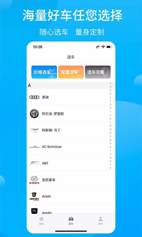 5、海量好车任你选择,可以自行根据品牌首字母、价格、配置等进行选车;
