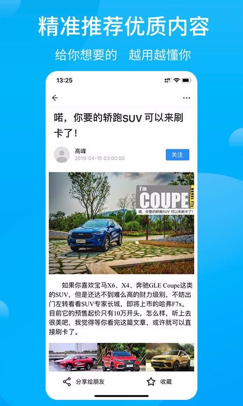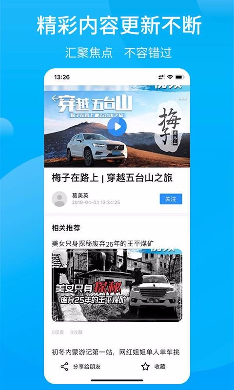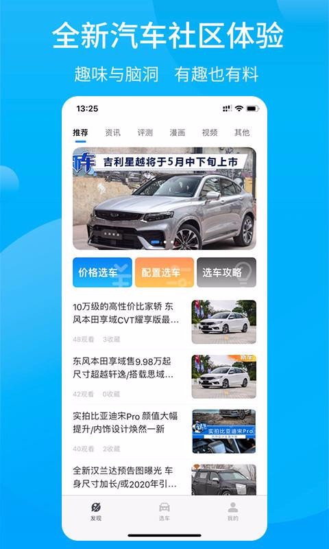 行车视线是一个汽车资讯平台,为你推送了关于汽车的各种资讯,包括评测、选车攻略、爆料等;用户在观看资讯的过程中可以选择需要的进行收藏,还可以将该资讯一键分享到其他平台;这里还有漫画专区,为你推荐了关于汽车的漫画,通过趣味的形式了解汽车;也有视频专区,通过观看视频的方式认识和了解车辆;关注资讯的博主后,该软件还会为你推送该博主的所有更新动态,让你随时都能浏览到喜欢的内容;同时还可以在该平台中选择车型查看报价和参数配置,并拥有庞大的图库,可以让你查看到喜欢车辆的真实照片。