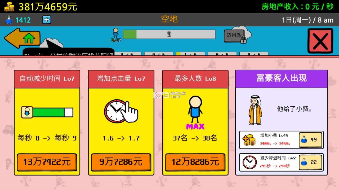 3、玩家们不仅可以在手机上体验从乞丐成为富豪的巨大跨越,而且需要玩家们来不断的点击屏幕来赚钱